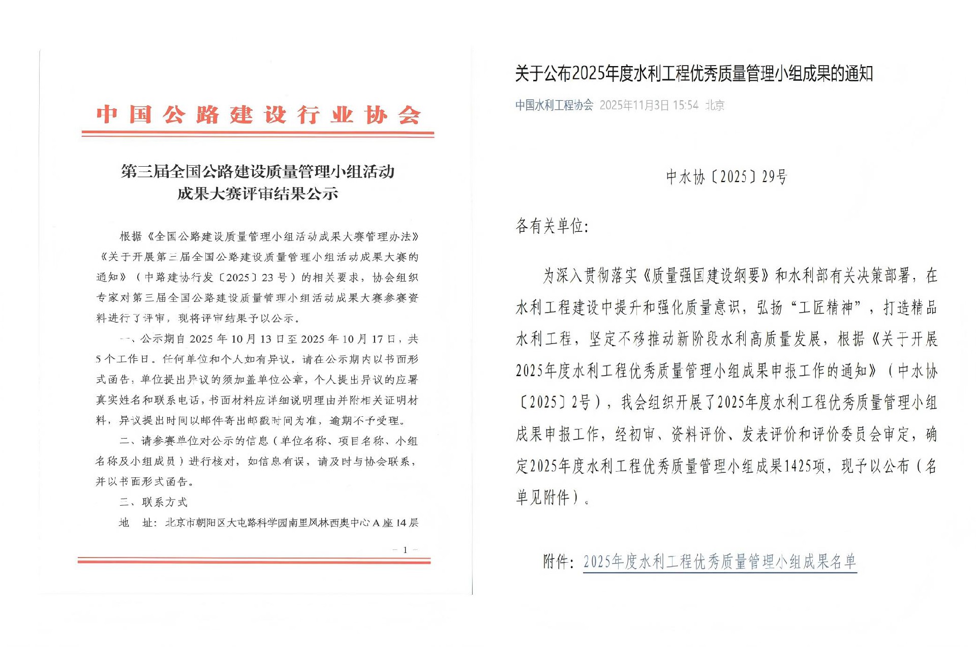 近日,中國公路建設(shè)行業(yè)協(xié)會(huì)、中國水利工程協(xié)會(huì)先后公布了第三屆全國公路建設(shè)質(zhì)量管理小組活動(dòng)成果評審結(jié)果和2025年度水利企業(yè)質(zhì)量管理小組競賽活動(dòng)結(jié)果。“···